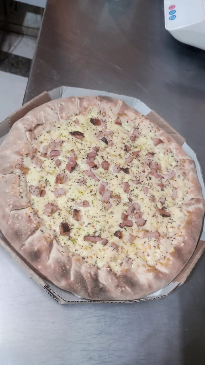 1º And.:Molho;CALABRESA; mussarela 2º And.: requeijão; provolone; parmesão; bacon e Orégano Borda: mussarela; Requeijão e Cheddar